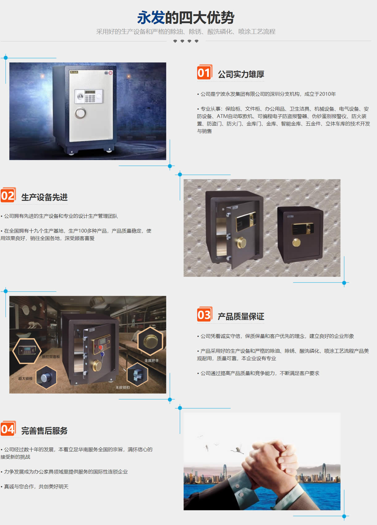 深圳永發(fā)安防產(chǎn)品有限公司 深圳永發(fā)安防產(chǎn)品有限公司,是寧波永發(fā)集團(tuán)有限公司的深圳分支機(jī)構(gòu),成立于2010年,專業(yè)從事:保險(xiǎn)柜、文件柜、辦公用品、衛(wèi)生潔具、機(jī)械設(shè)備、電氣設(shè)備、安防設(shè)備、ATM自動(dòng)取款機(jī)、可編程電子防盜報(bào)警器、偽鈔鑒別報(bào)警儀、防火裝置、防盜門(mén)、防火門(mén)、金庫(kù)門(mén)、金庫(kù)、智能金庫(kù)、五金件、立體車(chē)庫(kù)的技術(shù)開(kāi)發(fā)與銷售。